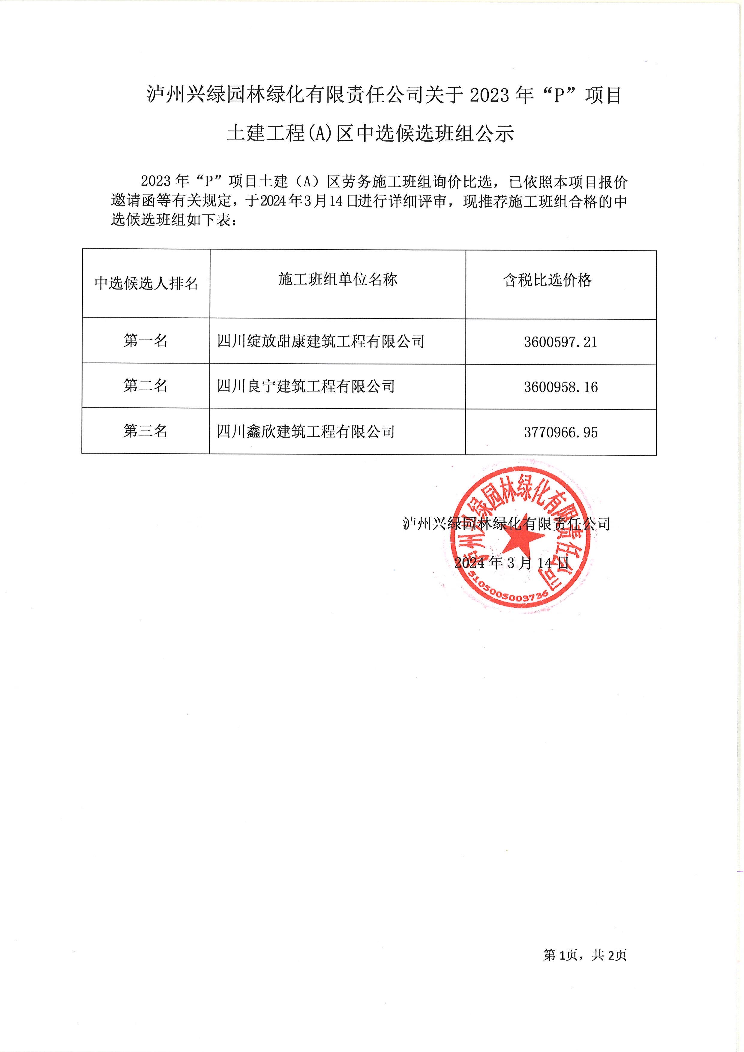 2023年“P”項目土建工程(A)區候選班組公示